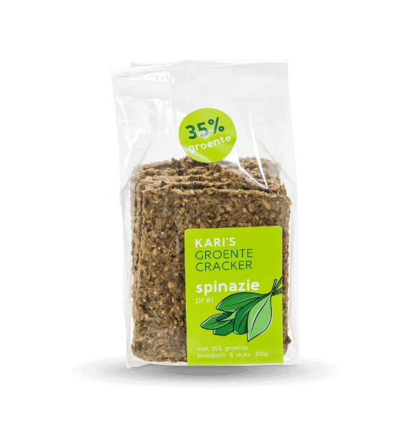 De spinazie/preicracker is hartiger; ideaal voor bij de lunch of als 4 uurtje. Met een volle en pure smaak. Sommige van de eerste proevers vinden dit meteen de lekkerste vegan cracker die we ooit gemaakt hebben.