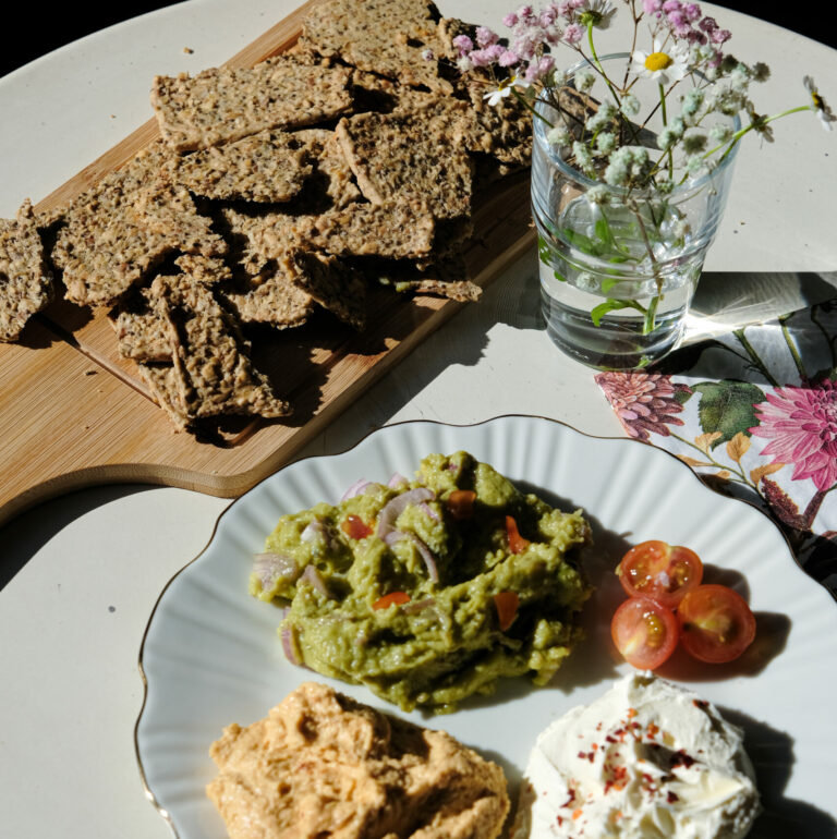 Een mooie toevoeging voor je volgende borrelplank: drie huisgemaakte dips voor de crackers. Een volle guacamole, smaakvolle hummus, en pittige roomkaas. Breek de crackers in stukjes en serveer bij de dips. Eet smakelijk!