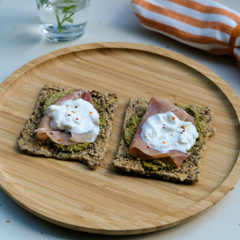 Mijn persoonlijke favoriete topping voor de crackers: Burrata! Maak het compleet met (zelfgemaakte) pesto en parmaham. Perfect voor een wat luxere lunch.