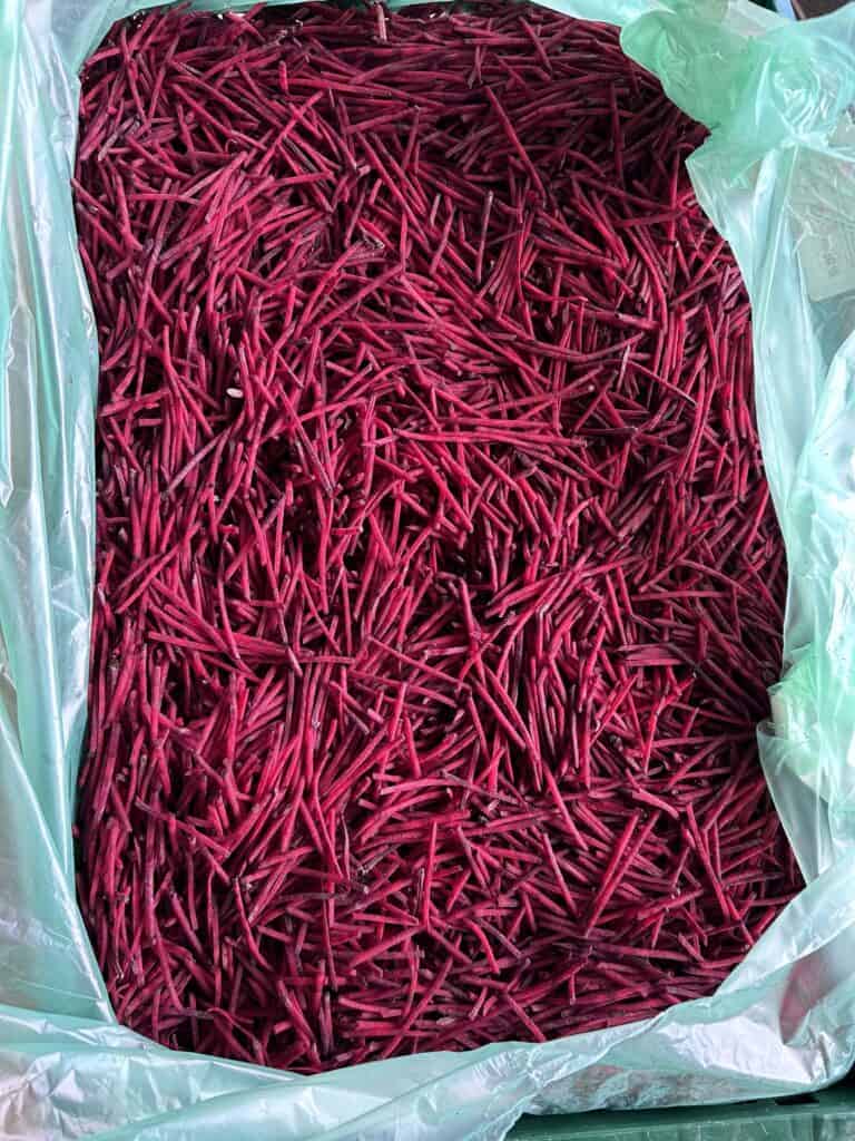Tonny vond een boer dat speciaal voor ons, vers na de oogst, de rauwe bieten schilt, snijdt en meteen naar ons op transport zet. De volgende ochtend om 7 uur ontvangen wij de bieten, nog heerlijk vers (zie foto), en verwerken we ze direct in het beslag.