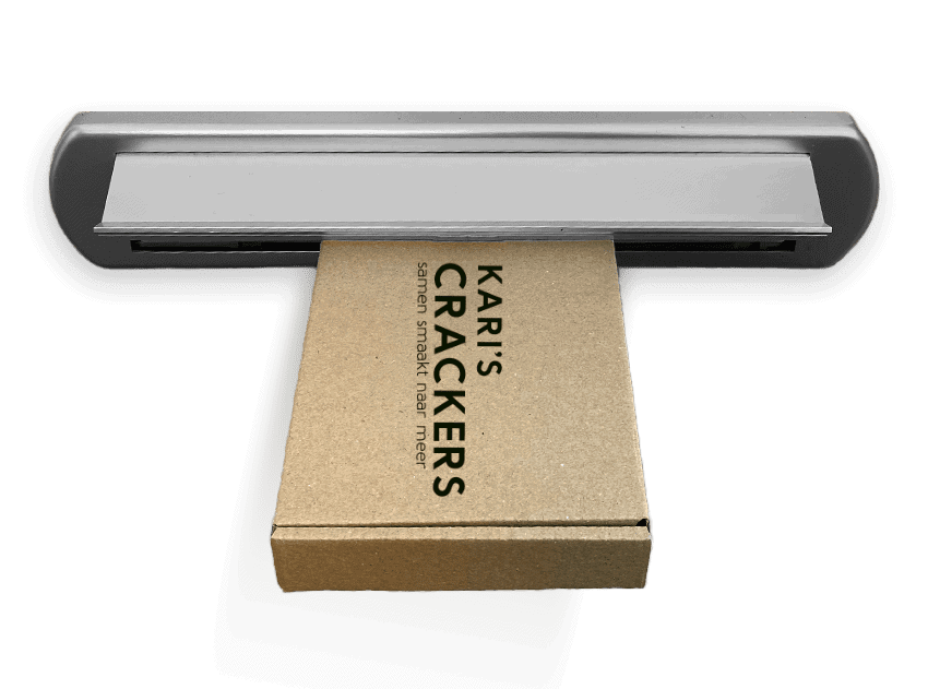 Je Kari´s Crackers proefpakket wordt verpakt in een mooie platte doos die perfect door de brievenbus past.
